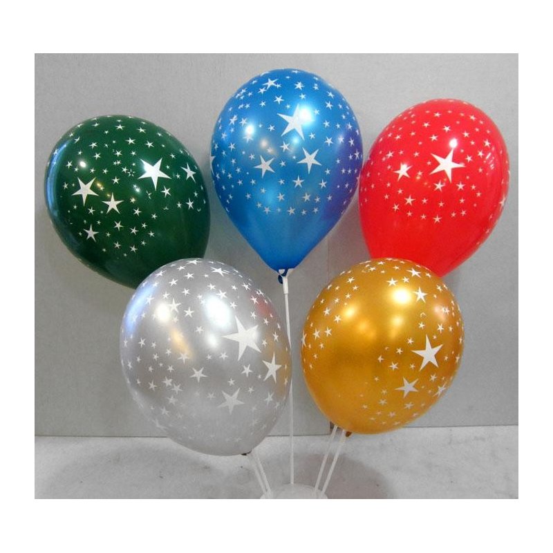 Ballons métallisés 27 cm, compatibles hélium, avec des étoiles imprimées tout autour. Latex biodégradable